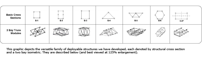 We can offer validated design concepts within our multi-truss system of modular structures as described earlier in our website, and we continue to evaluate new truss designs, components, and applications for industrial, commercial, military, disaster-relief, marine, and aerospace markets.